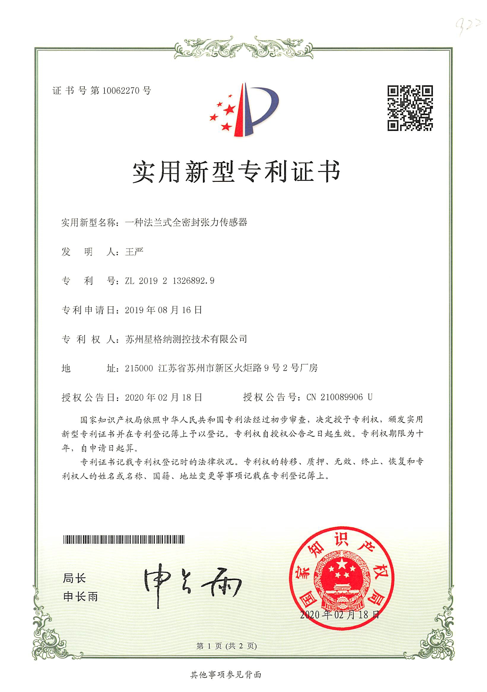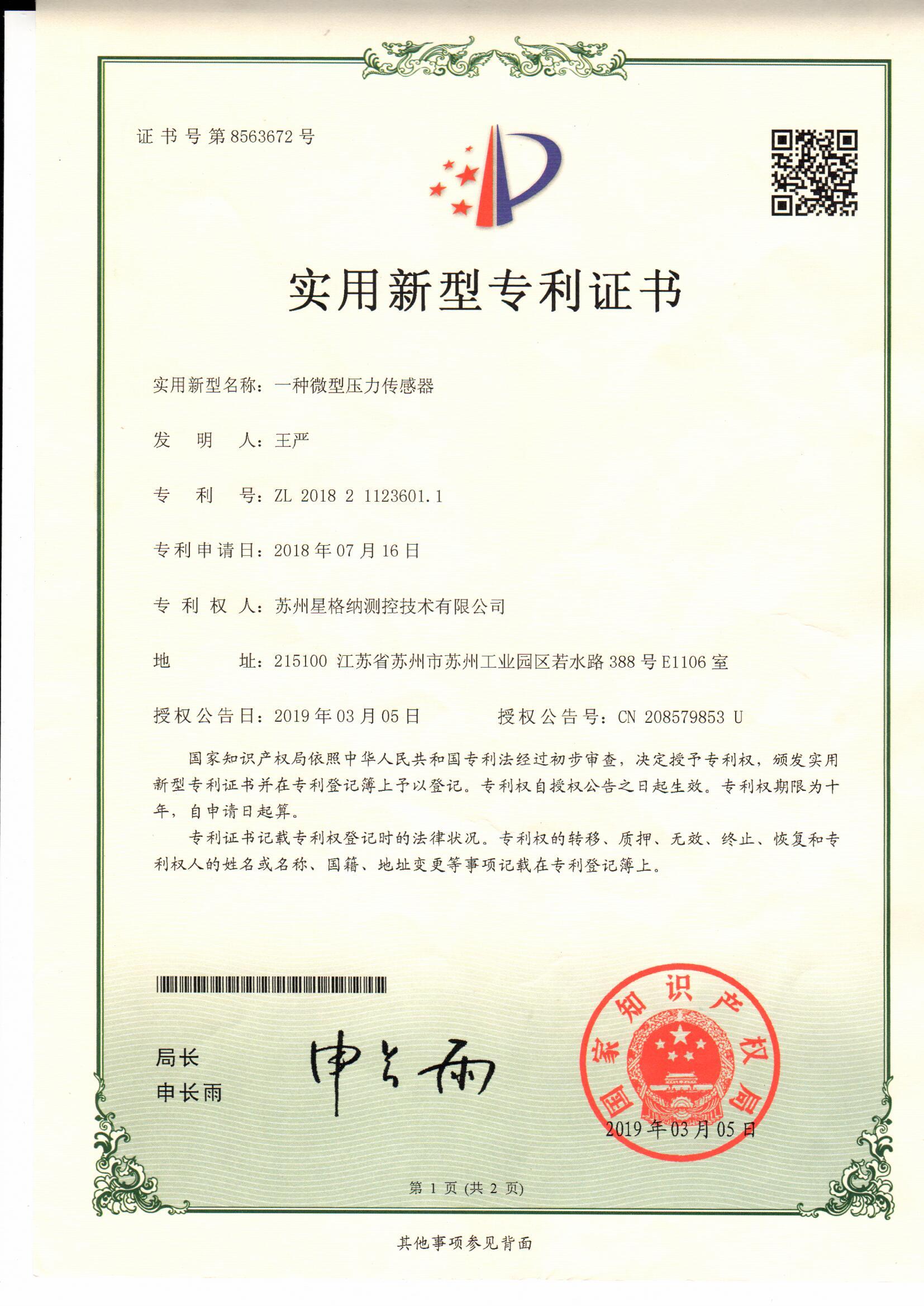 使用新型专利证书---苏州星格纳